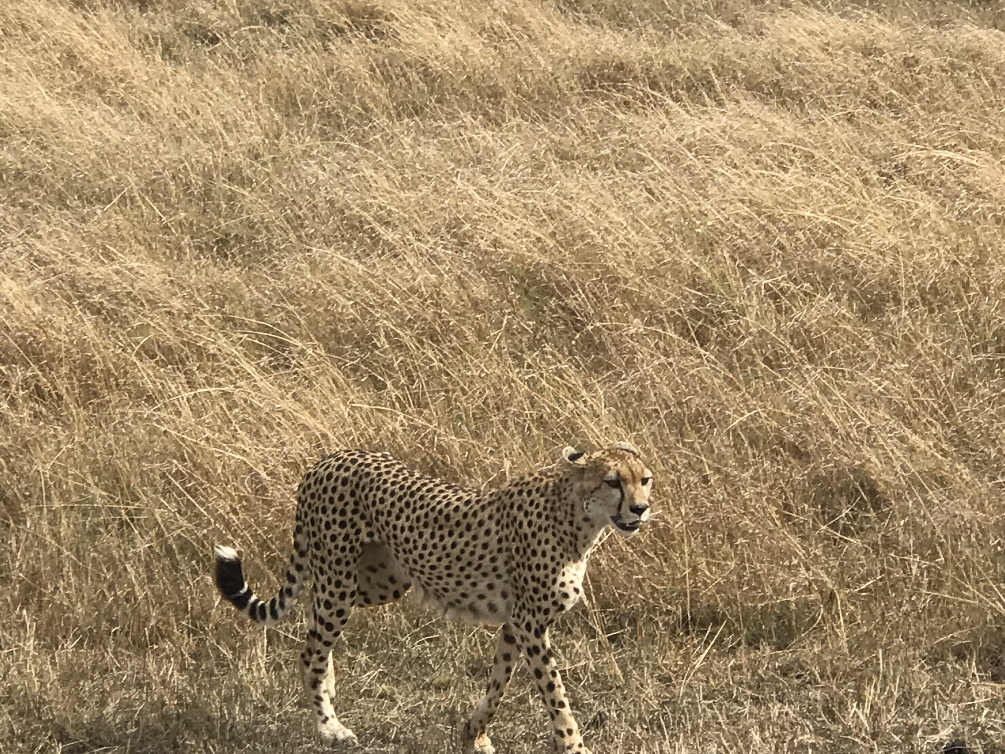 Today we were part of the group led by Saji and Salin and Josy and Tina. Our drivers were in top form, in continuous conversation with each other, Saji encouraged them with his knowledge of Swahili. Not very far we came across a pair of Ostrich and cape buffaloes. A lonely Giraffe treaded its way crossing us.Still the Chettah remained elusive. A sleek agile body emerged from the bush with a lushly spotted coat. She stops, looks around as if to decide the best route and slowly walked towards us. Just a few meters away from our vehicle she changes her route and walks towards a nearby scrub. My first sight of a Cheetah will remain in my memory for ever.
