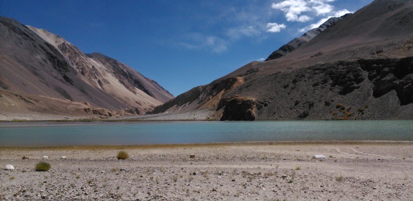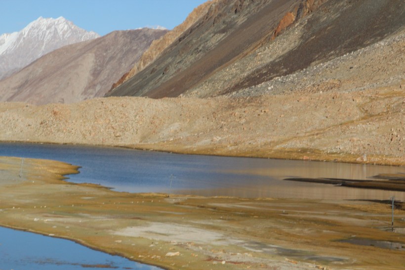 The first sight of Pangong Tso (a bit of the Lake seen through a gap in the mountains) is very exhilarating. The bright blue hue of the water, in the backdrop of the pale mountains, presents a sublime picture indeed.
