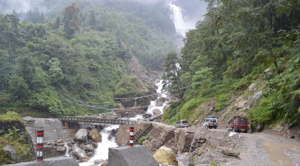 An hour after we left the check post, the driver of a jeep coming from Lachen warned us that our type of cars can’t reach Lachen because of a major water crossing. We decided to try our luck and continued our drive through the fragile stretch of road.