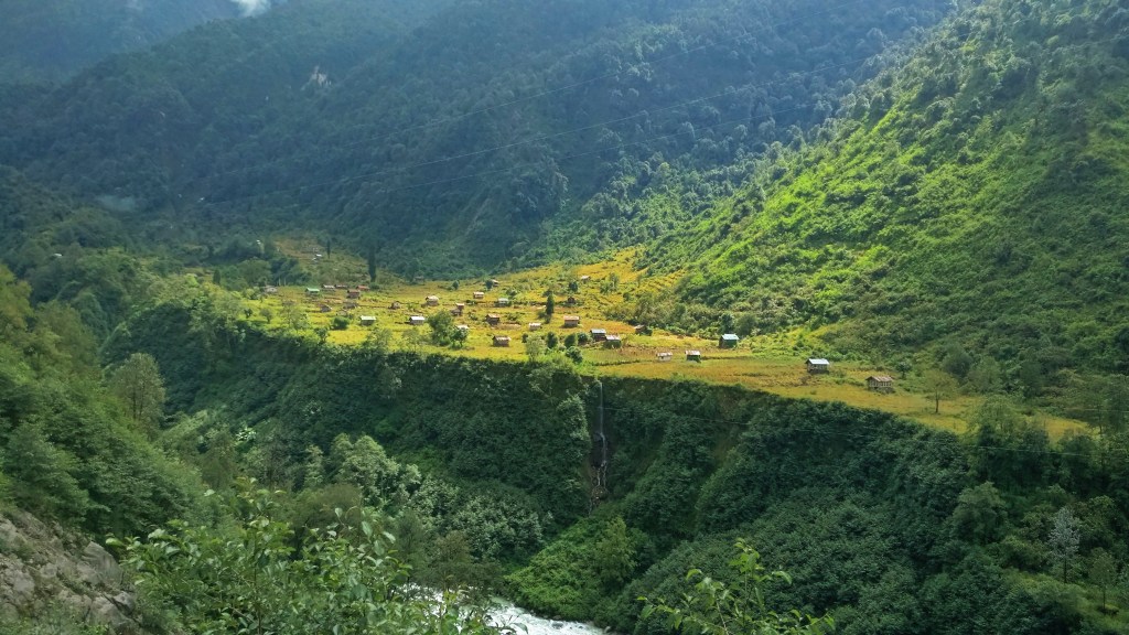 A set of small cottage like buildings constructed at the foothill of a mountain, overlooking a river caught our attention. Since it was a bit far off from the road, we couldn’t make out if it was a camping site or a settlement. But it looked quite attractive from the road.