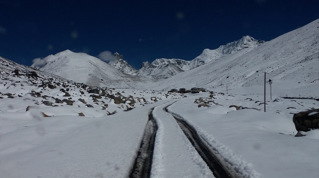 Lachen is a small town in North Sikkim at an altitude of 9022 feet and it was freezing cold. We woke up a bit late and came out of the blankets lazily. Managed to go for a short walk and saw a few snow covered peaks nearby. We could hear the sound of gushing water at the landslide location, but the Army had put a barricade on the road which prevented us from having a look. The hotel owner was kind enough to give us a decent breakfast at such a short notice with their limited resources and we thanked him for his hospitality. With a heavy heart, thinking about the missed opportunity to enjoy the beauty of the high altitude lake, we retraced our tracks to Chungthang. When we reached the water crossing that we had struggled to cross the previous evening, we found that the water level had come down, and we stopped the cars for a photo shoot.