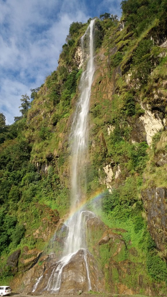 We had to return through the same route we travelled to North Sikkim, ie, via Chungthang, Mangan and Dikchu. Shortly after passing Beechu, we came across the tall, lean waterfall Bhewma, where the mist and morning sun together formed a rainbow in the waterfall.