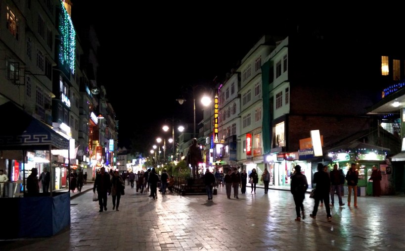 We drove without many stops aiming to reach our destination by lunch time. Even though the popular `Tashi View point’ was only a small detour from our route, we skipped the place which is famous for the Kanchenjunga views since we had already seen it in Pelling. There were a few waterfalls like Butterfly falls and Bakthang falls, but we didn’t stop at these places because we had already seen much bigger waterfalls all through this trip. We reached Gangtok, spotted a nice restaurant and enjoyed a tasty lunch. We then checked into the Army Guest House, which was ideally located on a hill top. Later in the evening, we visited M G Marg, the popular shopping area, where vehicles are not allowed. In contrast to our previous few days in Sikkim, this place was busy with a large crowd.