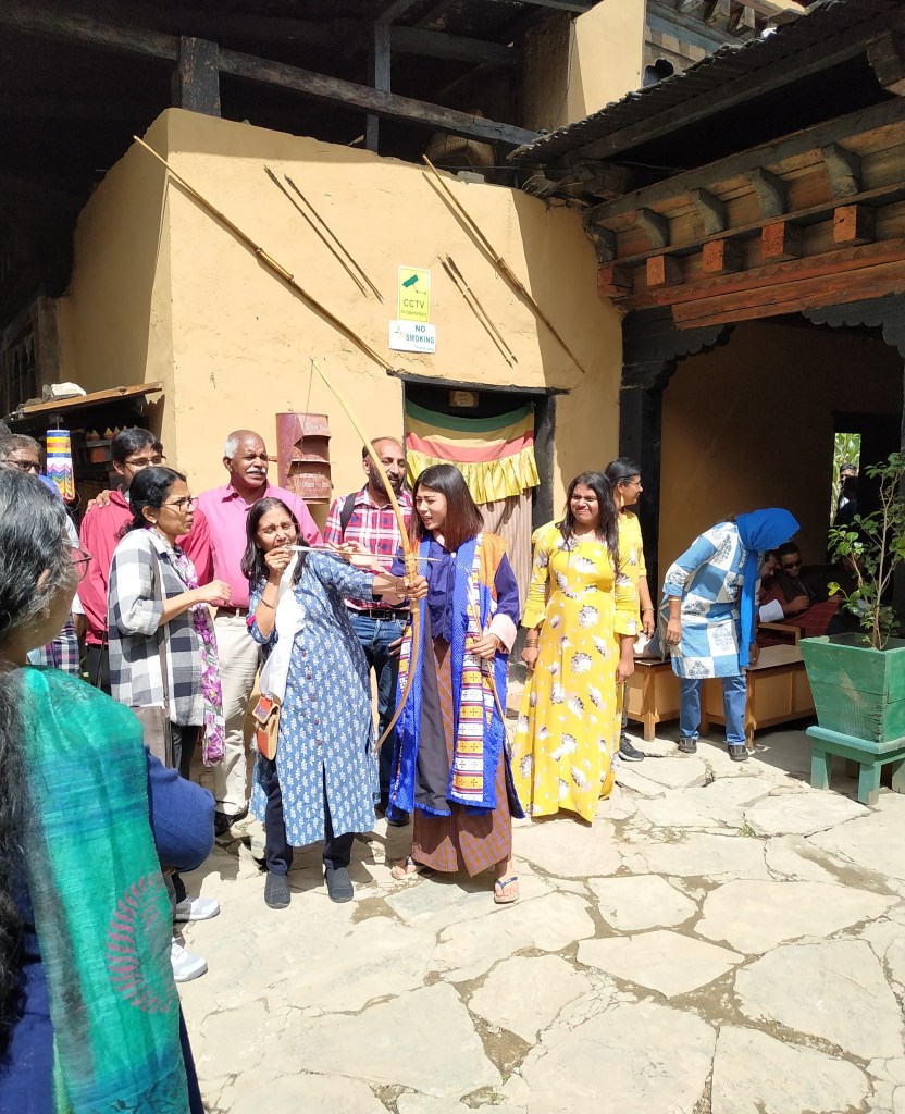 Outside among the stalls which housed these traditional items, we saw a talented wood carver quietly working in his workshop. A victim of cerebral Palsy he uses his feet to carve out stunning wooden carvings and paintings. Some of us brought his products as a gesture of goodwill. We also got a chance to try the national game of Bhutan which is “Archery” and a local Dart game known as “Khuru”.