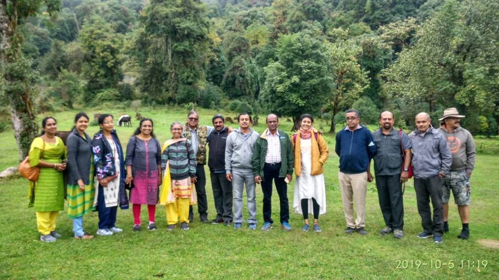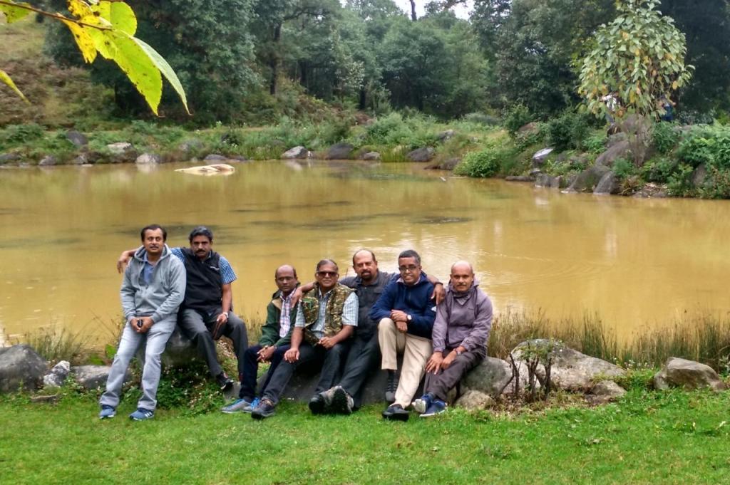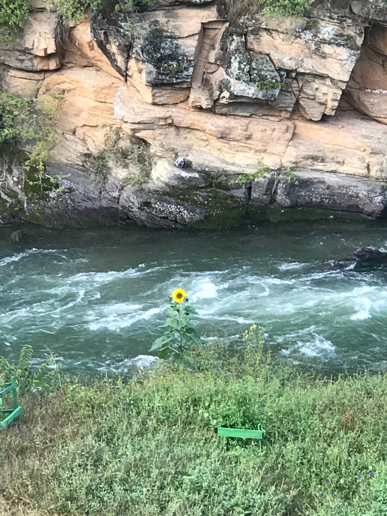 I freshened up fast and opened the side window and saw a totally different scene. The clouds seemed to have vanished and there was bright sunshine all around. A lonely sun flower waved at me from the banks of the river. We went down and met others and had a nice stroll around, and tried fixing the location for the Group Photograph.
