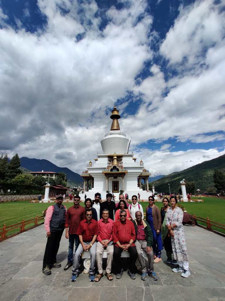 We came out of our buses to a spectacular view of this magnetic setting. The memorial is built in 3 layers. Watching from below the Stupas seemed to grow from the ground like giant white mushrooms wearing conical Bhutanese hats with golden spikes. Lush green lawns encircled the stupas. We went all the way to the apex. At an altitudeof about 10,000 feet the view was ethereal.