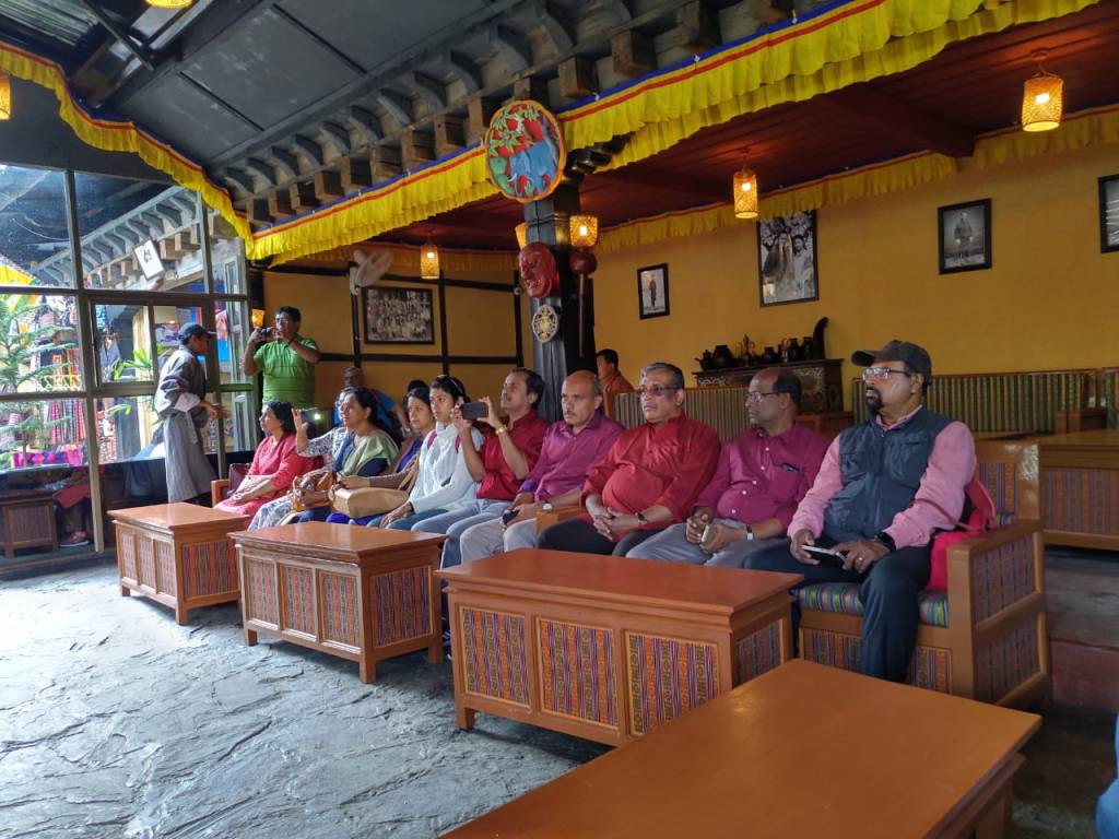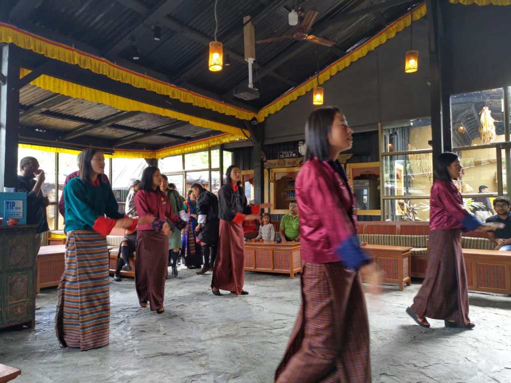 A living Museum and a Major initiative to preserve the culture and traditions of Bhutan, a flash back into the past Bhutanese way of life which lost its essence in the modernization era. That is “Simply Bhutan” for you. The Museum is built with old reused materials like timber, old doors and window frames. Visitors entering the Museum are seated and greeted with a shot of Arra the local Rice drink. Inside was a large hall which had photos, artefacts and paintings that adorned the walls highlighting the cultural richness of Bhutan. We settled down in special ornate chairs and were entertained with a folk dance by young girls while having our lunch.