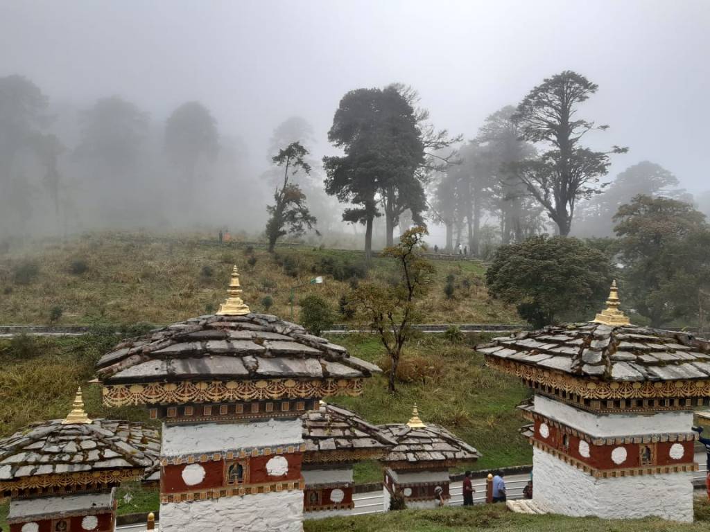 Dochula pass connects Thimpu to Punaka. A memorial made to honour 108 Bhutanese soldiers who died in a clash with foreign militants in 2003.108 Stupas were made by the Queen to their memory. These stupas are called as Druk Wangyal Chortens in the local language.