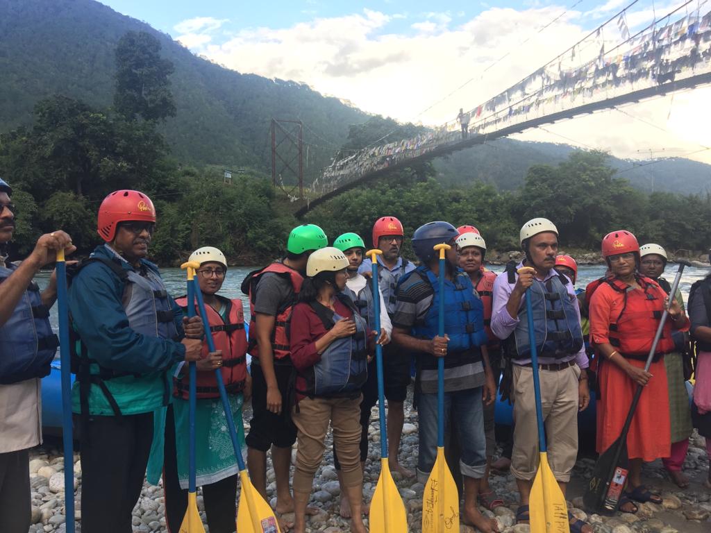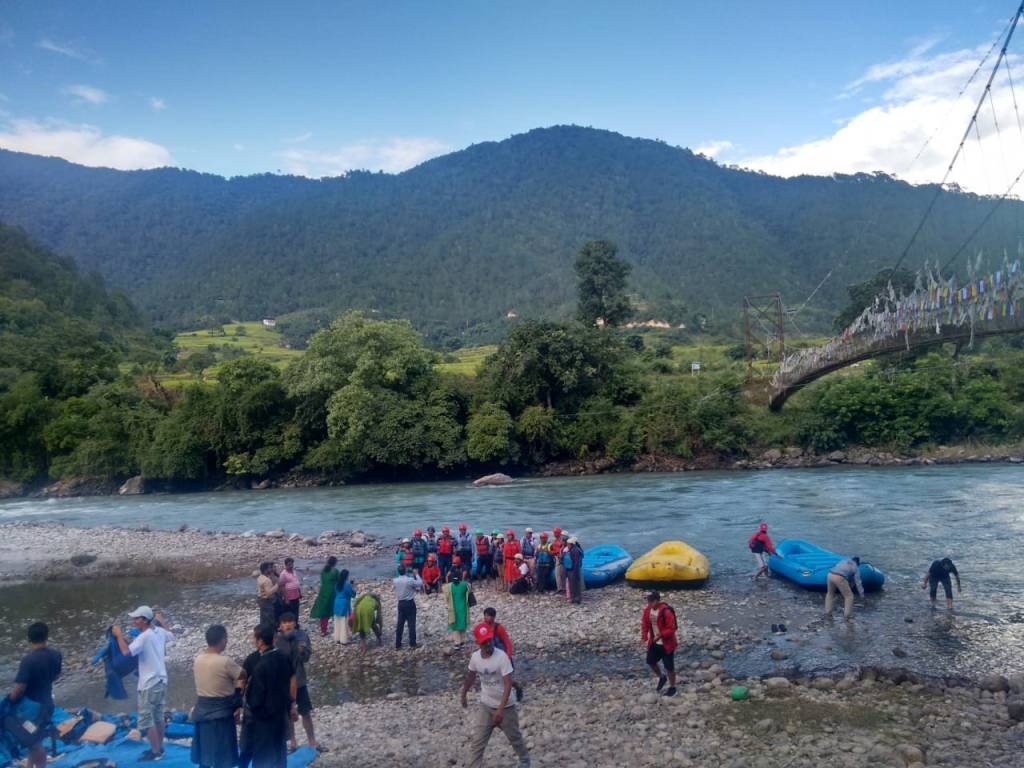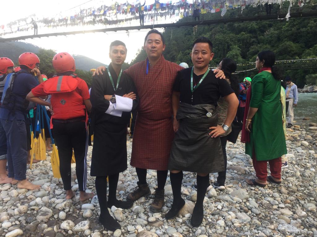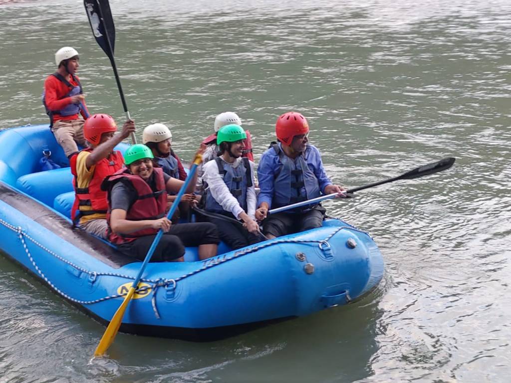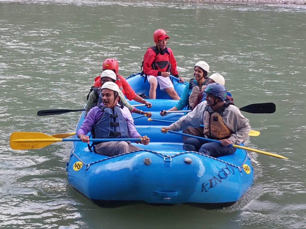 As we reached the banks of the Mo Chhu river, we formed different groups and armed with protective helmets, life jackets and paddles got ready for a rejuvenating rafting experience. After a briefing about how to row and how to handle the rough patches, one by one our rafts started cruising down the gushing waters of the river.