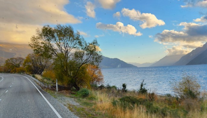 After having lunch at Queenstown, we proceeded to Te Anau about 175 km away. In the beginning, for about an hour, the road runs along the shore of lake Wakatipu and the colourful trees on the sides present a pretty picture.