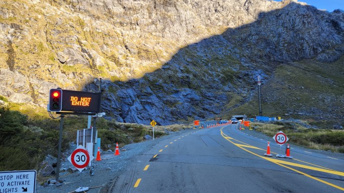 A few kilometres before reaching Milford Sound, there was a narrow 1.2 km long tunnel cut through the mountain – Homer Tunnel – where we had to wait for our turn to enter the one-way passage.