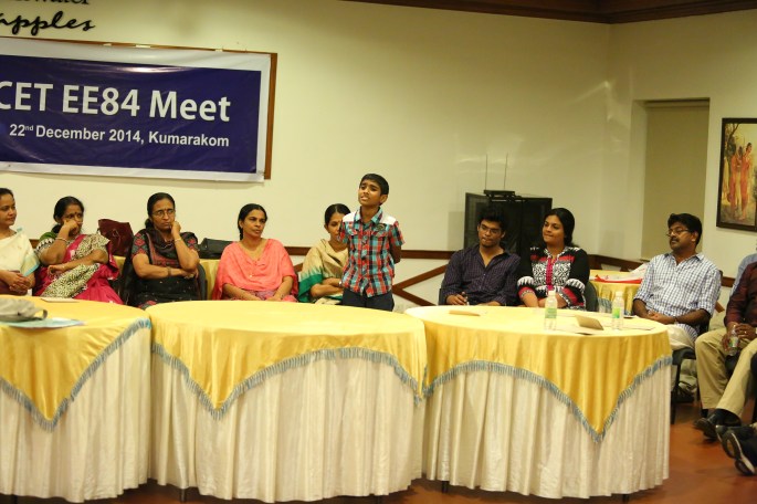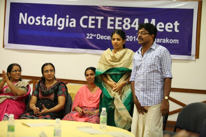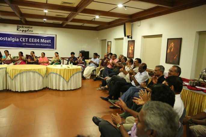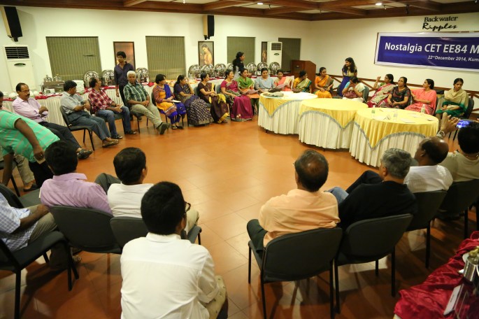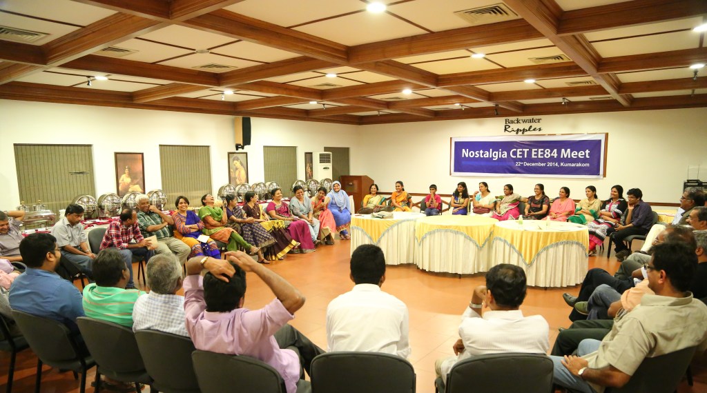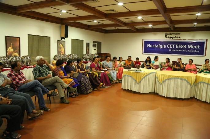 Five years after the memorable Silver Jubilee Reunion of 2009, 27 of us classmates met at Kumarakom on the 22nd of December, 2014 to celebrate the 30th Anniversary of our graduation from CET. And the venue we chose was the `Backwater Ripples’, one of the best resorts set on the shores of lake Kumarakom. There were 42 of us actually, 15 family members included.